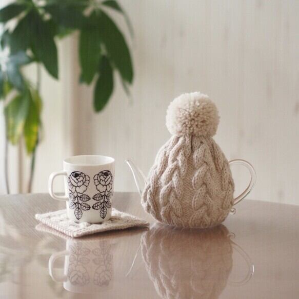 寒い季節に活躍する、大きなポンポンがアクセントのティーポットカバーとマットのキットです♪